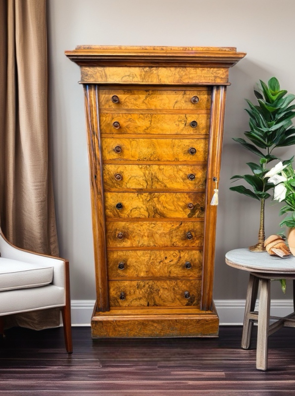 19TH century burr walnut wellington chest. Complete with 8 shallow drawers and locking side panel. This is a superb and hard to come by chest of drawers, generally in very good, usable condition. Please note, this chest is not perfect and reflected in our price. Various minor nicks and chips to the veneer, none original key, this does work, but not as crisp as the original would be. All original handles, although showing various minor degrees of ware and minor damage.