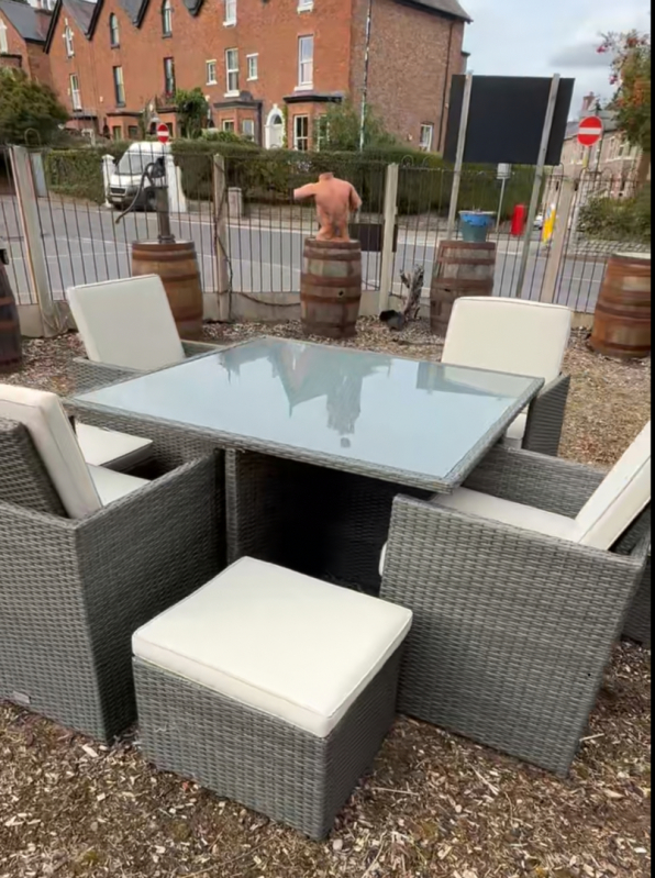 Rattan effect table with glass top, complete with 4 armchairs and 4 stools (seats 8 in total), complete with full set of weatherproof cushions and also waterproof cover (worn). The entire garden set is in very good, used condition. All chairs, stools and cushions fit underneath the table for storage.
