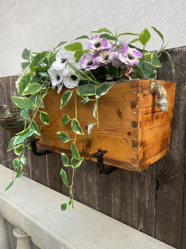Restored vintage wooden toilet cistern, lead lined internally, externally three coats of exterior teak oil (so suitable for internal or external use). Mounted on cast iron brackets. Drainage hole in the base. Suitable for many storage uses around the home, also makes a great planter! Several available.