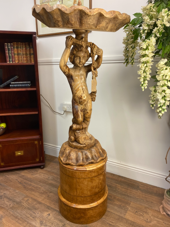 Beautiful, large 19th century Italian carved wood putti. Large carved clam shell over head, standing on a maple wood plinth. Fantastic patina and colour to this piece, with nice intricate carving. We have finished this with a clear wax and buffed to a deep sheen to bring out a lovely warm colour and also helps pick out details in the statue. A real statement piece!
