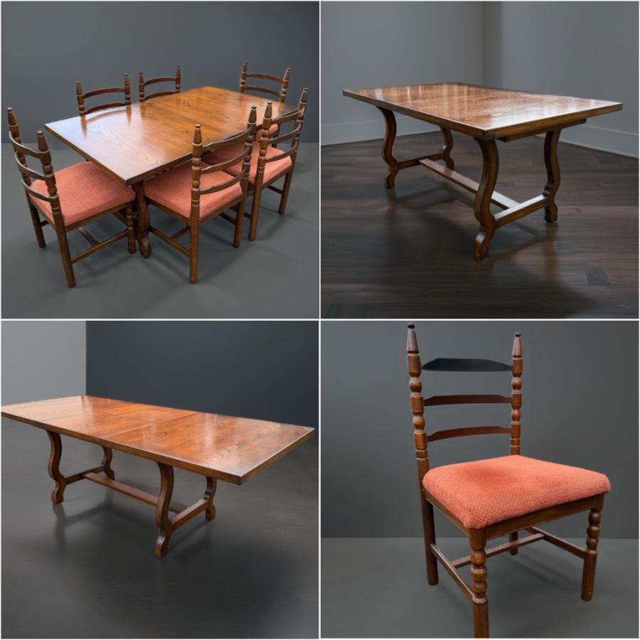 Spanish Toledo extending table with 6 matching chairs, all in very good condition. The table will seat 8 when extended.