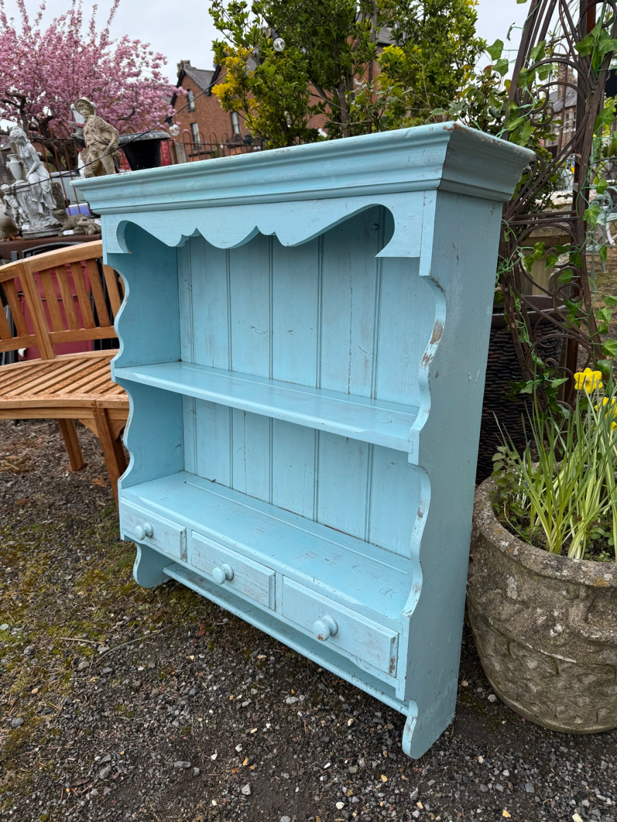 Wall hung plate rack with three small drawers to the base. Shabby baby blue paintwork, use as is or an easy project to refinish.