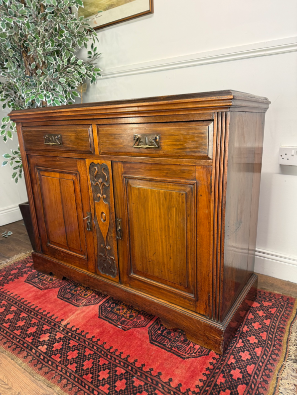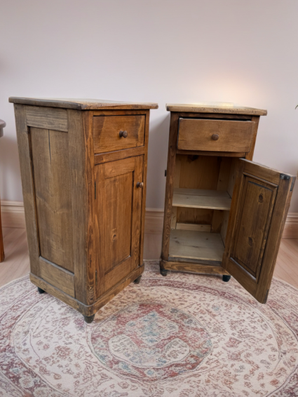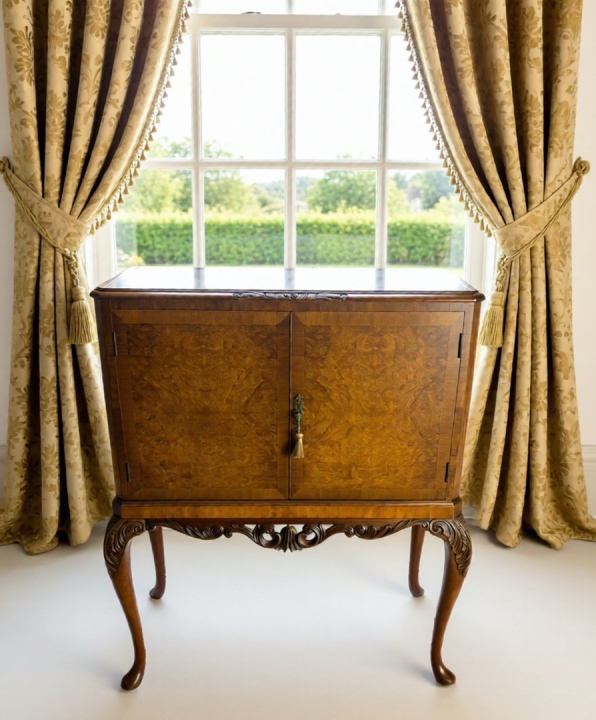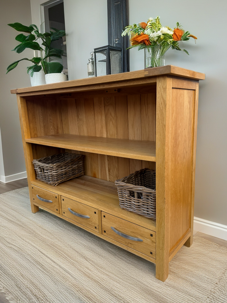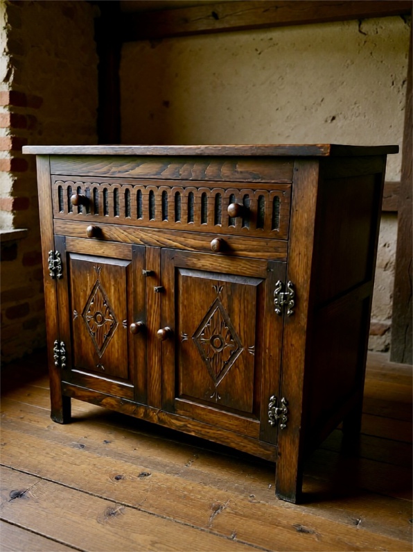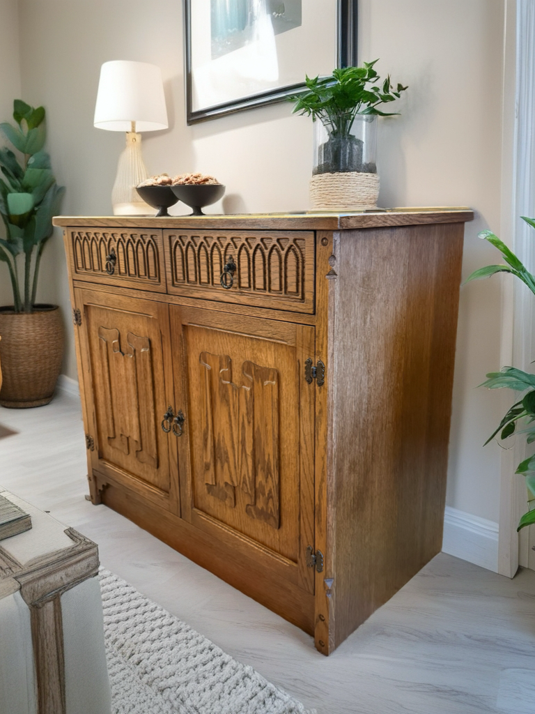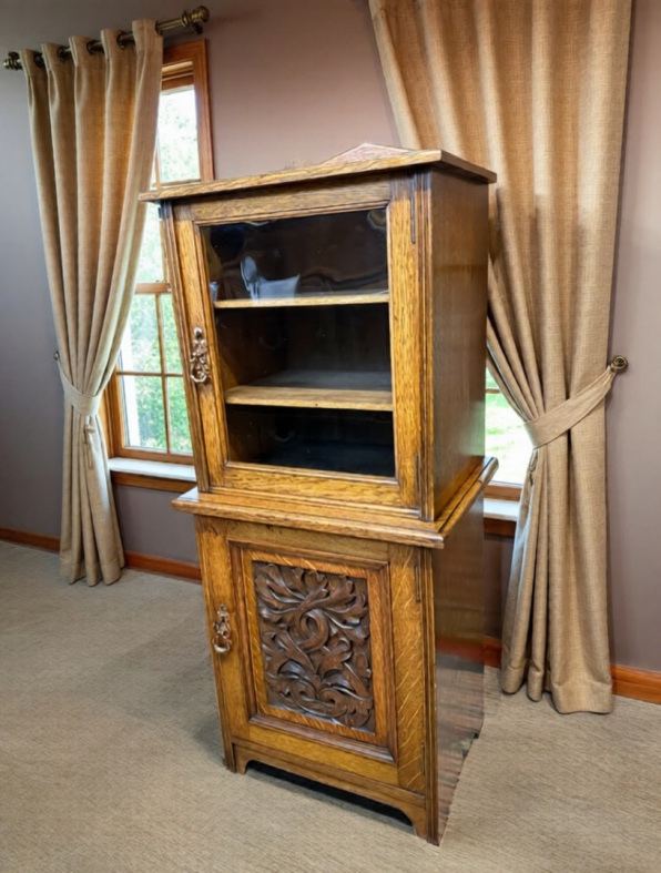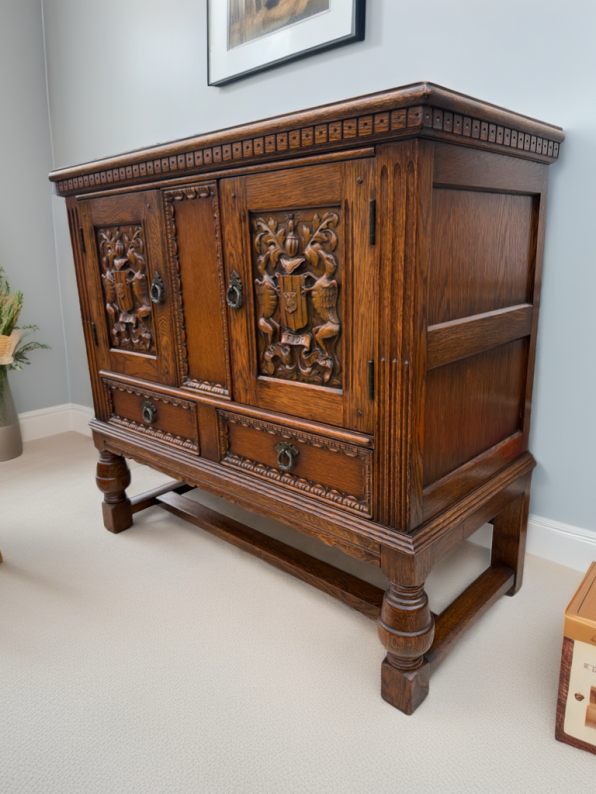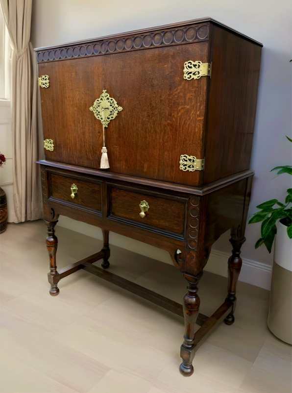 Early 20th century solid oak two door cabinet with brass fittings, on top of oak stand with two drawers. Internally there is one shelf in each compartment (fixed, but can be made higher or lower with some diy adjustment). Excellent condition throughout, complete with working lock and key.