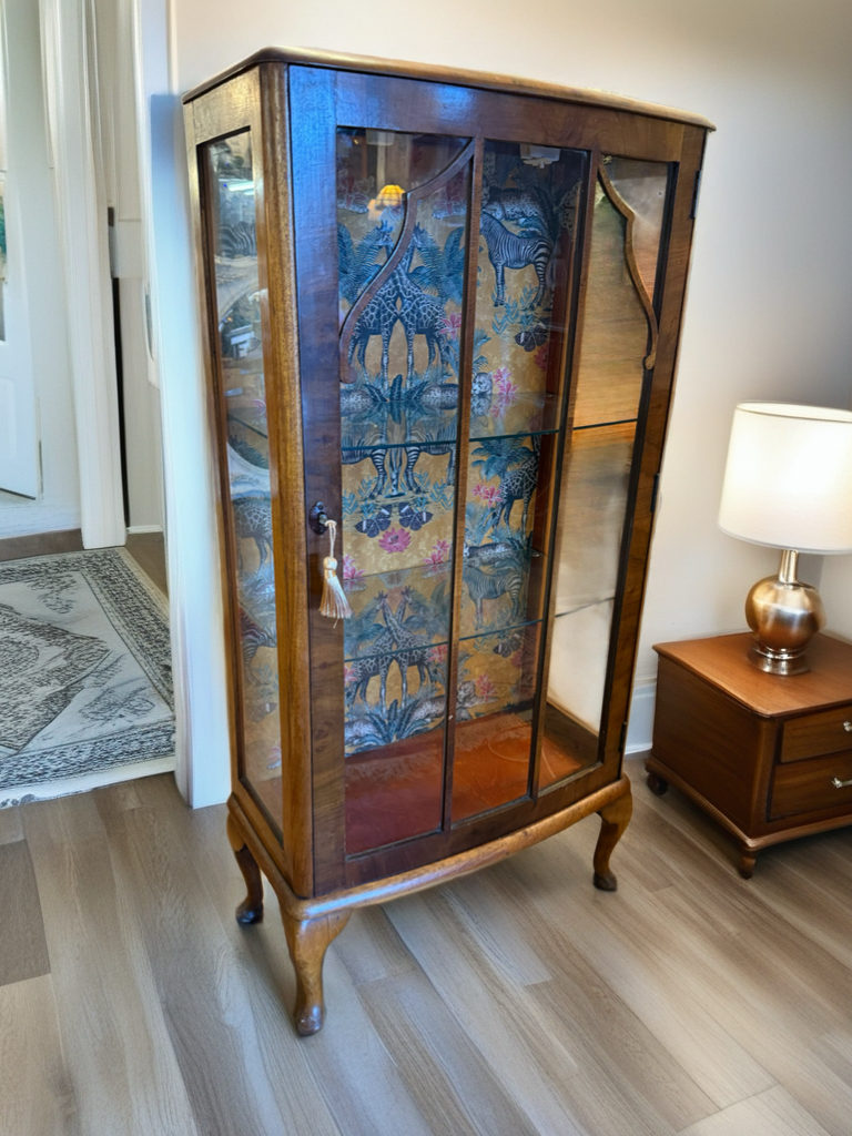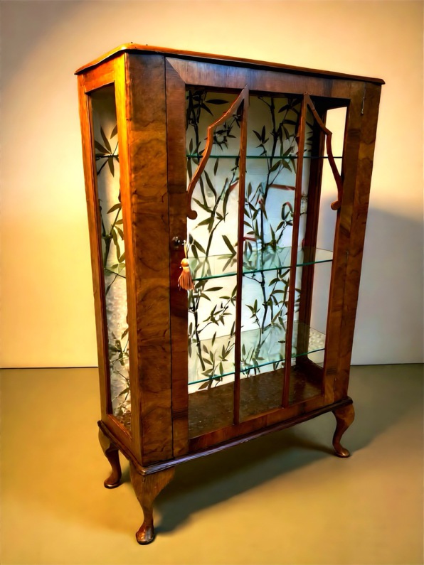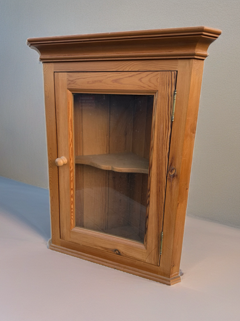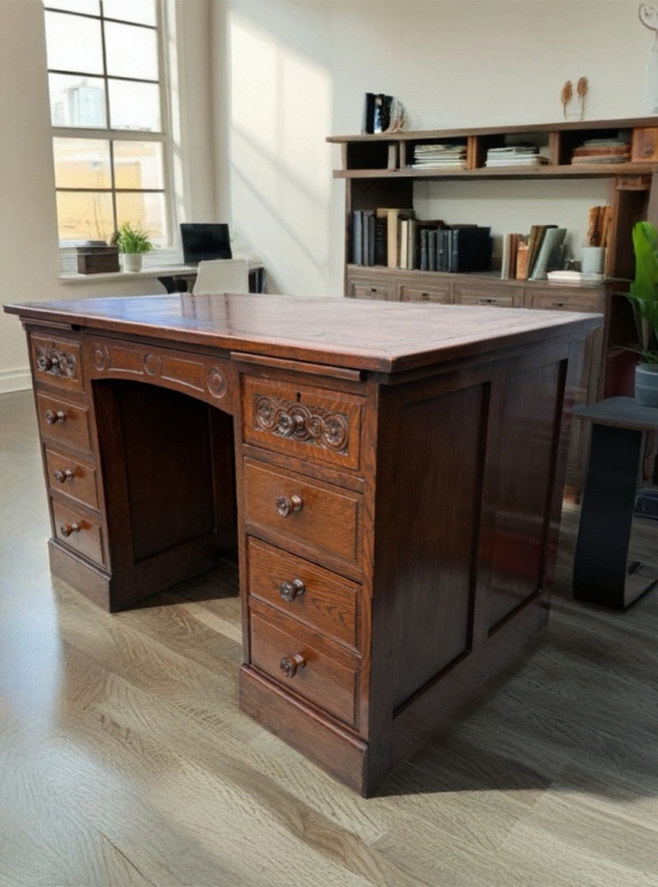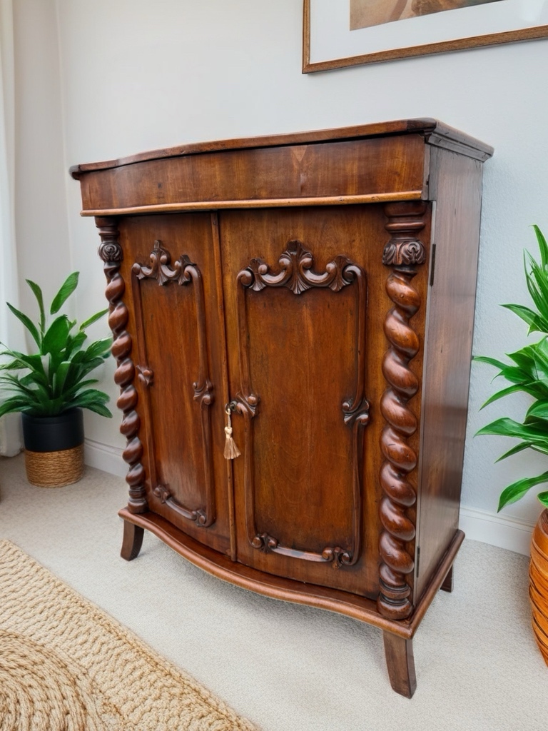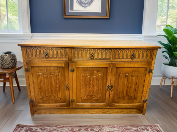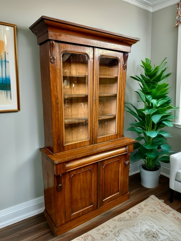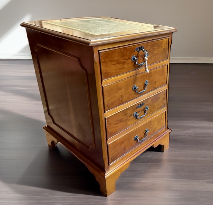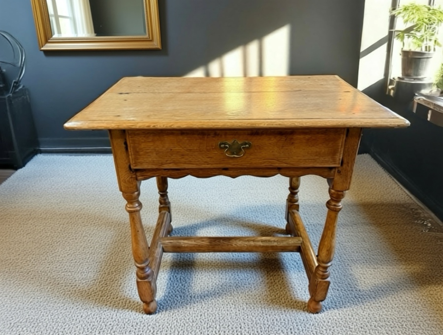 Early 20th century solid oak two door cabinet with brass fittings, on top of oak stand with two drawers. Internally there is one shelf in each compartment (fixed, but can be made higher or lower with some diy adjustment). Excellent condition throughout, complete with working lock and key.