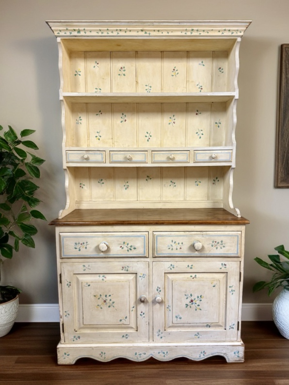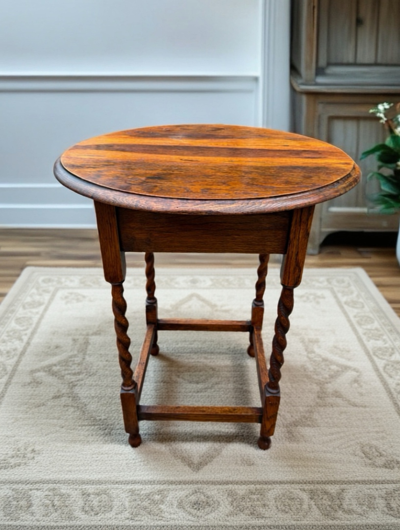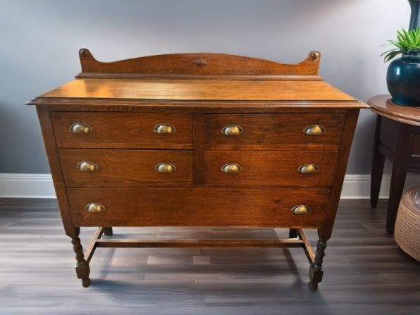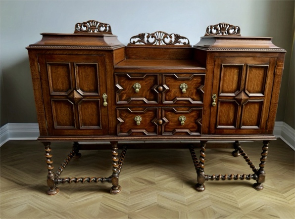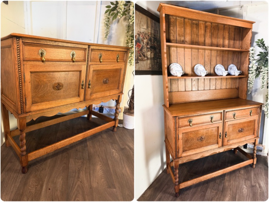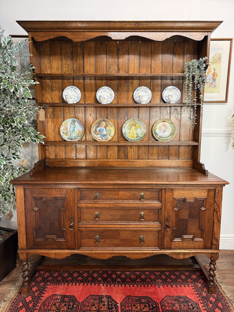 Early 20th century golden oak dresser base on barley twist legs. Features a double door cupboard with two drawers above. Above that is a plate rack, which is removable if you would rather just have the base! All in very good condition, with newly refurbished top.