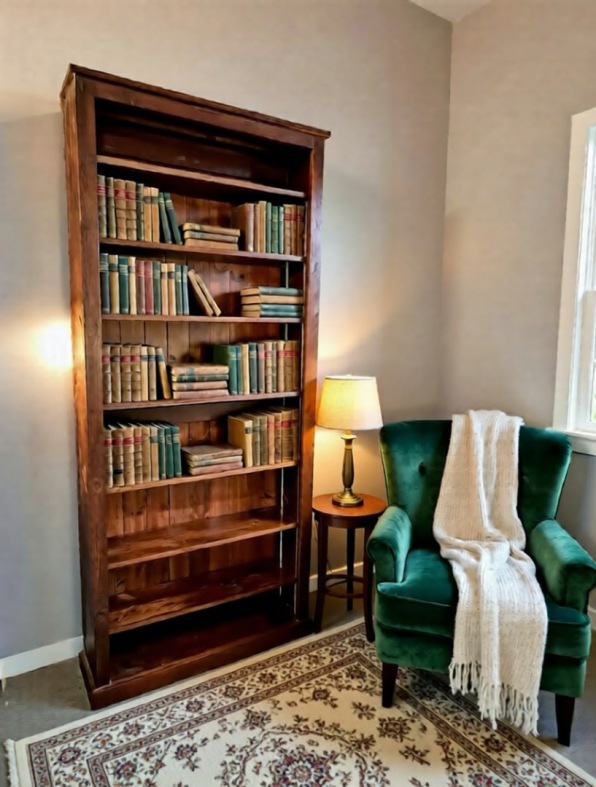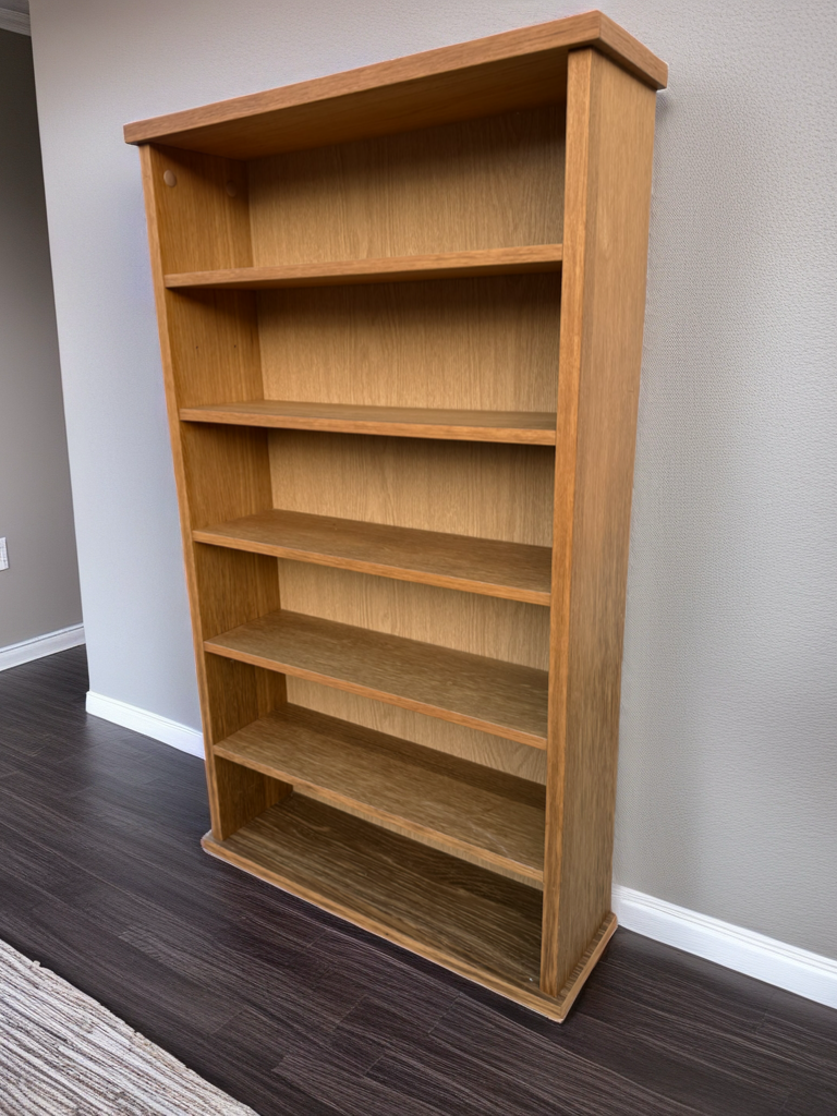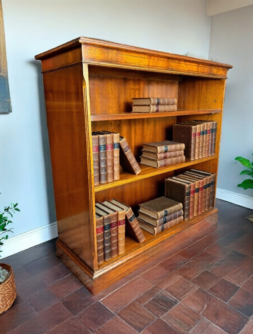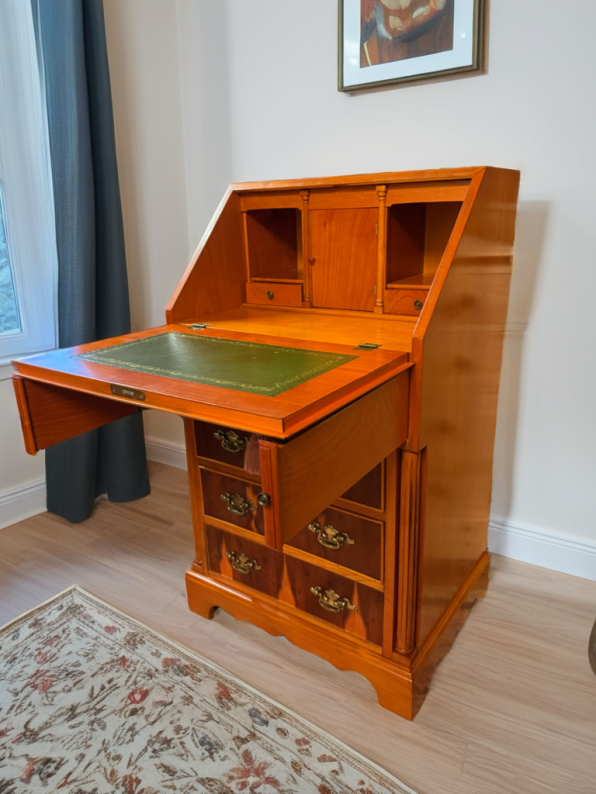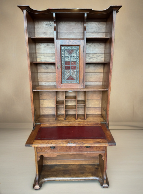Lovely Arts and Crafts period Bureau bookshelf. Tall and narrow proportions, featuring Open shelving with central stained glass cupboard to the top portion, underneath, there is a drop down, leather top writing shelf with drawers underneath. Very good condition throughout.