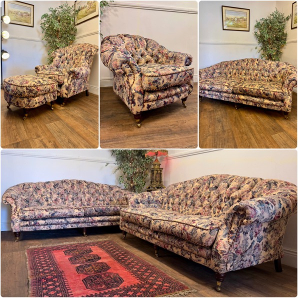 Very attractive, traditional, floral chesterfield 5 piece suite, consisting of matching pair of sofa's, wingback armchair with footstool and smaller club chair. Available as a set or separately. Featuring scroll arms, deep button back, feather filled cushions and turned front feet with brass castors. All in excellent condition throughout.