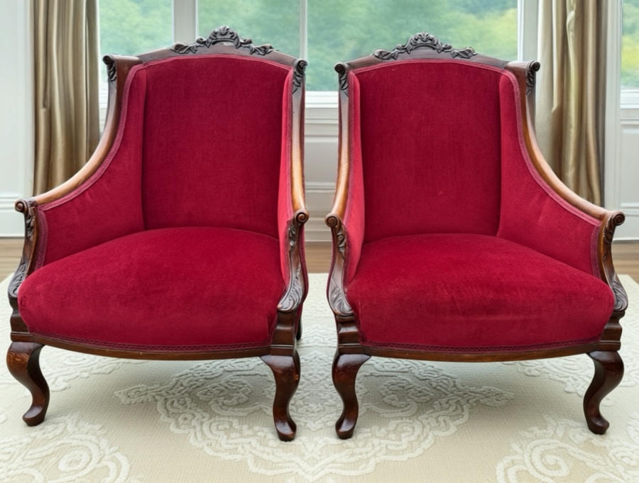 Stunning matching pair of Edwardian / early 20th century tub chairs. Elegant mahogany down swept arms, short cabriole legs and finished in a plush deep crimson fabric. Both in excellent condition