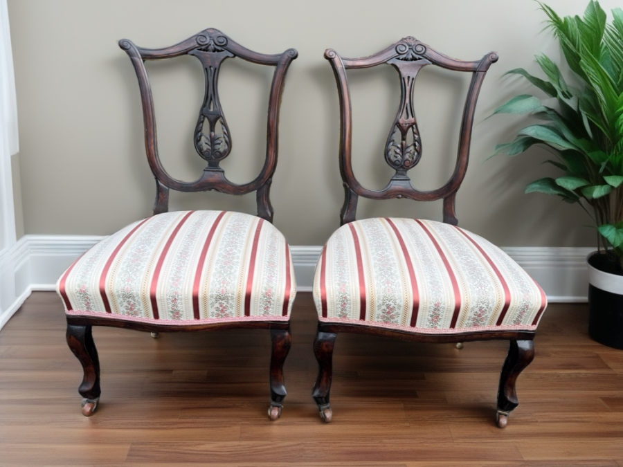 Matching pair of elegant Edwardian chairs with striped upholstery and ceramic castors to the legs. Excellent condition throughout.
