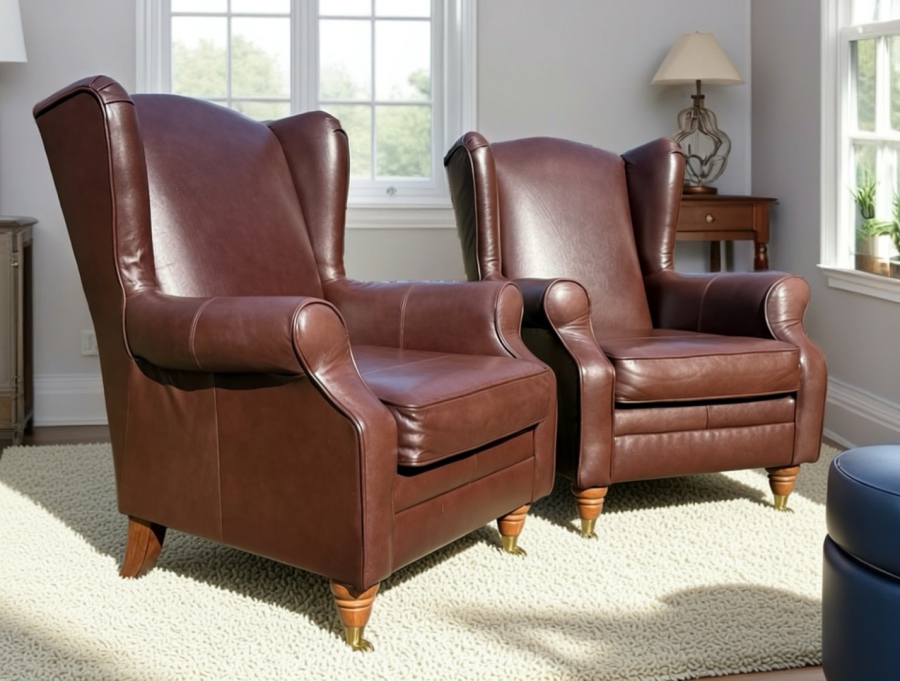 Matching pair of brown leather wingback armchairs, both in excellent condition. Turned wooden front legs with brass castors.