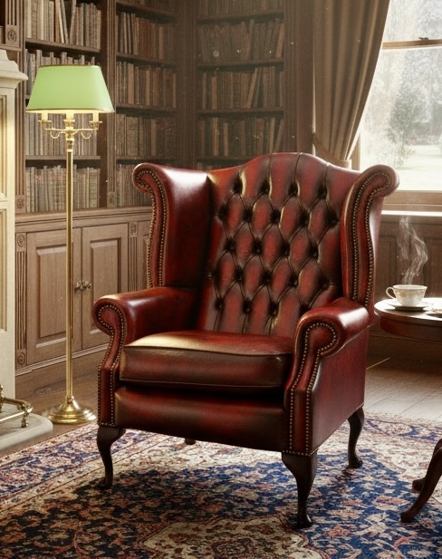 Classic ox blood leather chesterfield armchair. Deep button back, scroll arms and studded detailing. Excellent condition throughout.