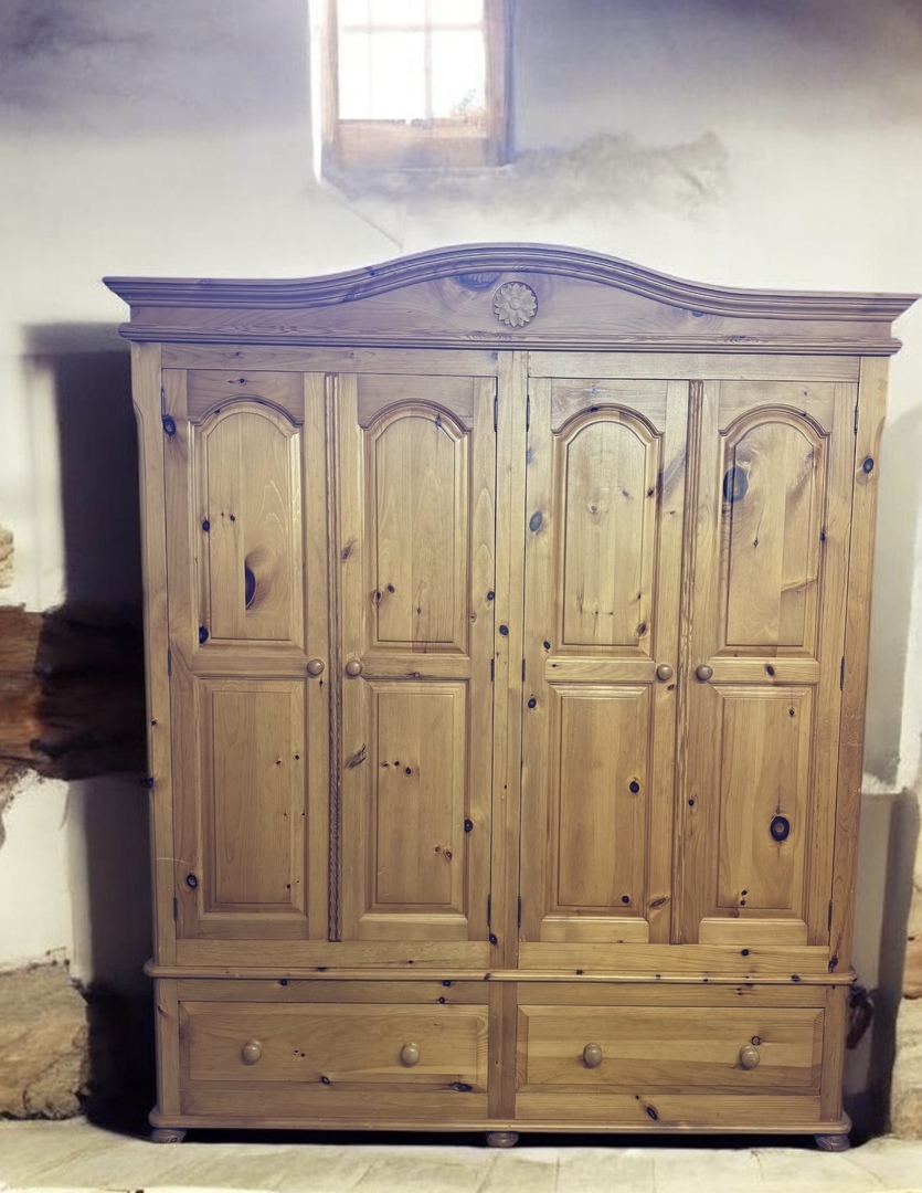 Louis XV style French armoire / wardrobe. Featuring double full length mirrored doors, short cabriole legs, internal hanging rail and small drawer to the base. Generally in very good condition for